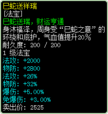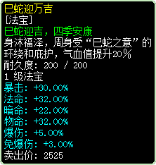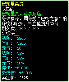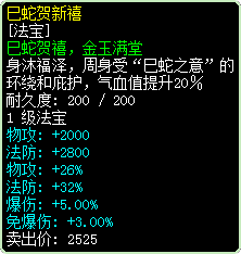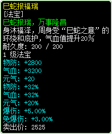 4、巳蛇法宝拥有爆伤和减免爆伤效果。暴伤上限为45%(九蛇战天)和减免爆伤最高27%(九蛇战天)